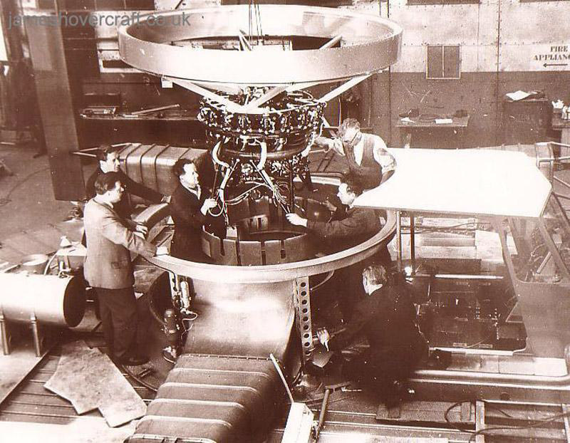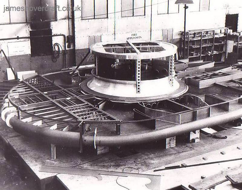 Here is shown a later stage in the SRN1's build, including the cockpit (right), engine, and support for the propeller. Also can be seen one of the two air ducts (lower middle) used to bleed air from the main lift fan to provide thrust in the form of two directional air jets Peter Insole The shell of the SRN1 during construction. The engine mount and main intake is clearly visible as is the inner shell of the plenum chamber. The top criss-cross of beams is the start of the outer layer of the plenum which, when reaching the edges of the craft, deflected the air downwards creating the famous air cushion effect by Momentum Curtain Peter Insole The first flight of the SRN1 on the concrete slipway at East Cowes. The astonished crowd of photographers and journalists would have seen nearly a foot of air beneath the craft during its hover. Note the ground wheels attached to the four corners of the craft Peter Insole